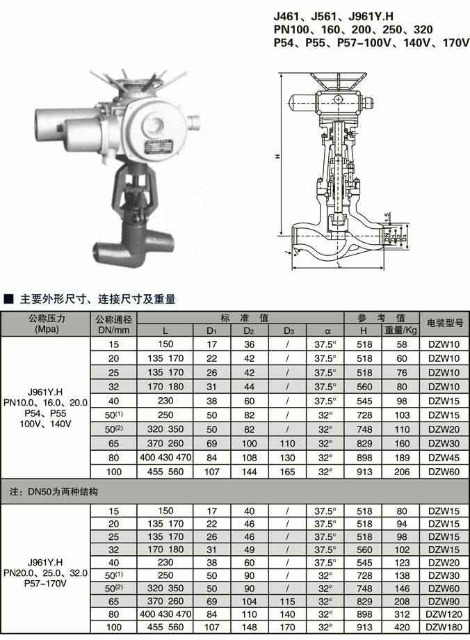J961H/Y-100  | 10  | 15  | 11  | ≤450  | 水、蒸汽、油品  | |||