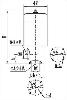 型号  | 通径(DN)  | ΦW  | ΦB  | H  | h  | bxb  | n-d  | 匹配机械泵型号  |