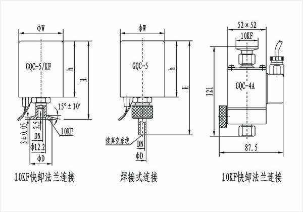 GQC-1.5  GQC-5型电磁高真空充气阀是以电磁力为动力,当接通电源时,阀门被关闭,使真空系统与大气隔离;切断电源时,阀门处于开启状态,随之大气由外界引入真空系统。GQC-4A型电磁高真空充气阀具有通电开启和通电关闭两种功能,阀内带有空气过滤器,可用作向真空系统充气。